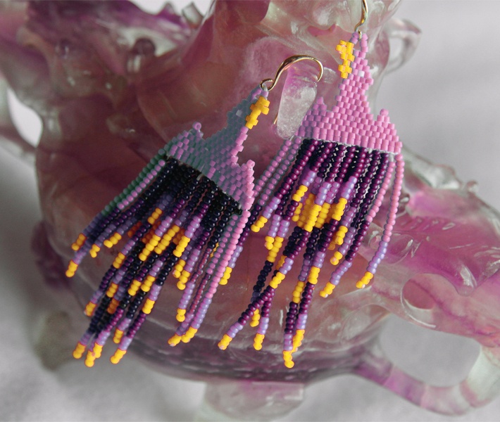 About the artist: Cherokee-descent Nicole S. currently makes her home in Greenfield, Indiana, where she is proud mother and grandmother to her children. Beading is in her blood and naturally a favorite past time, just as it was for many generations before. Nicole has suffered from Parkinson disease since 1992 but the shake of fingers cannot deter her from creating beauty. While it may take much longer than a healthy person, beautiful arts will come to completion with loving care.