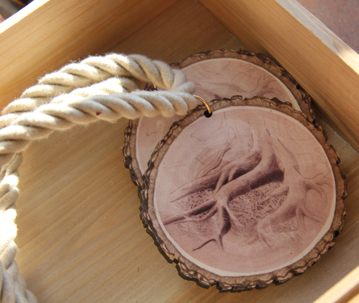 Accessorize your window coverings with curtain tie backs featuring your own art on realistic, faux wood rounds on ivory ropes.