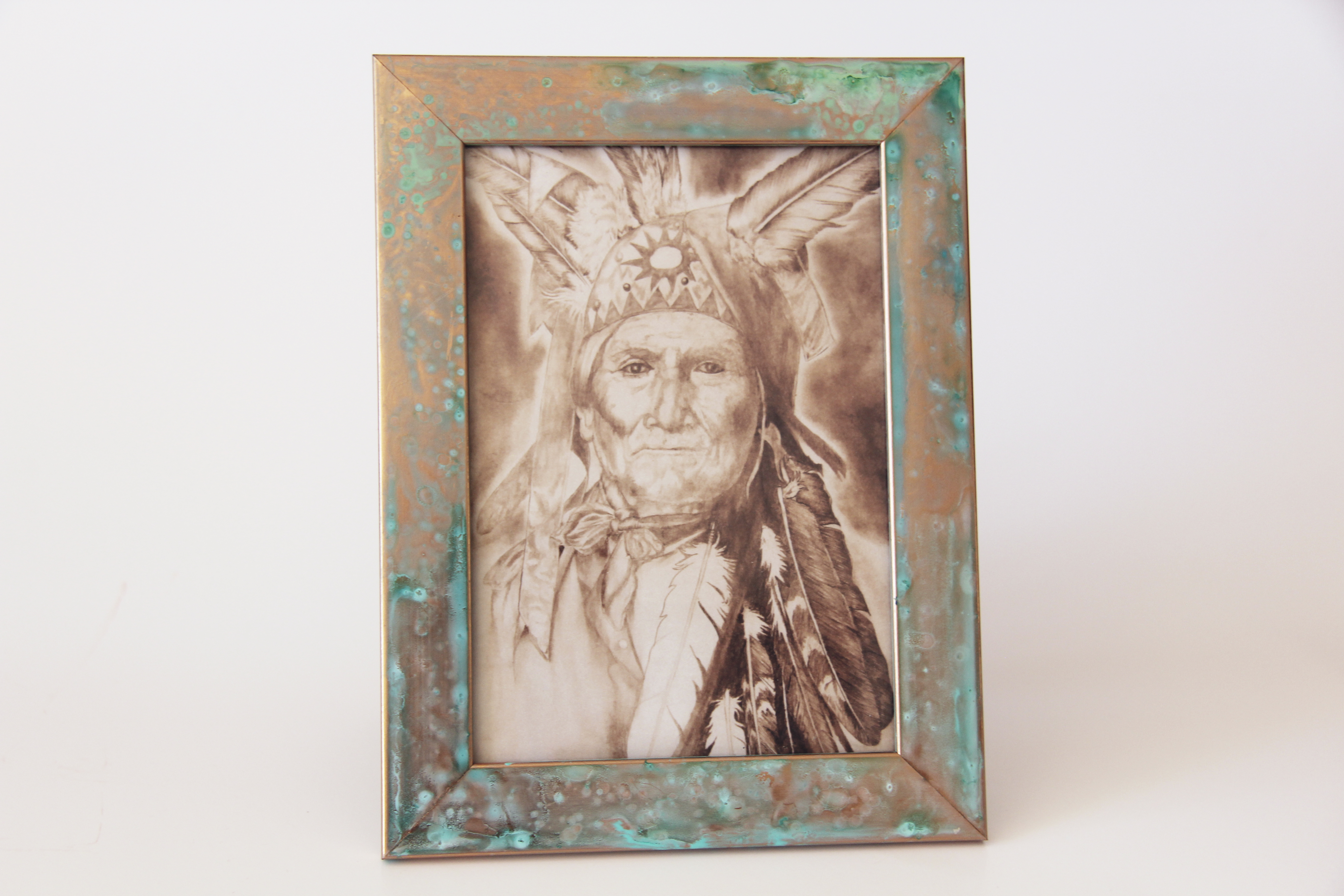 Sometimes, an unusual frame is in order to create just the right effect. Imagine your art in a faux copper frame with realistic appearance owing to the realistic patina we apply. The art will be printed on fine art paper and is framed under glass.