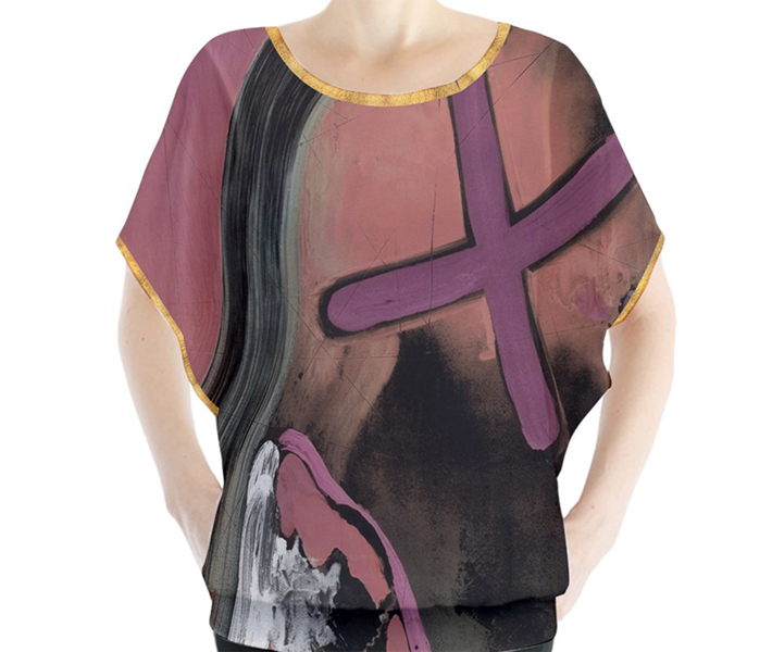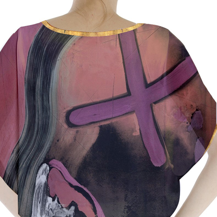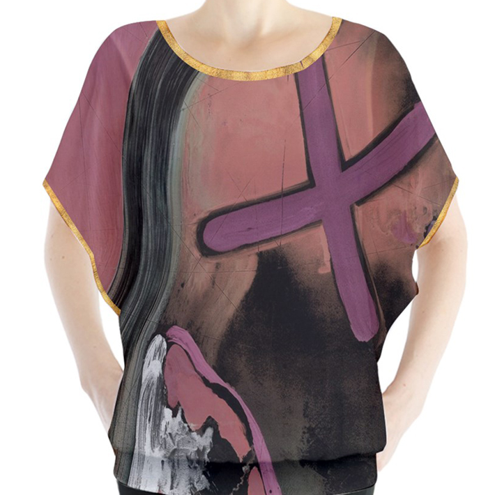 Get that gentle billow look with this chiffon blouse complete with a batwing sleeve cut and gold-leaf emulated neckline and sleeve trim. Great casual look for the Spring and Summer when matched with shorts and a pair of sandals.