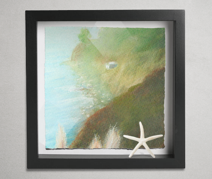 This artistic expression of Big Sur’s Esalen comes in a ten-inch square glass shadow box with customized mini starfish insert. Images are printed with archival quality inks that provide a vibrant gamut and accurate color resolution. The acid-free, cold pressed watercolor paper gets torn by hand to yield deckled-edges, for a true fine art appearance. To view other available curio box paraphernalia, select the Designs > Shadow Box Elements tab in any blank designer template.
