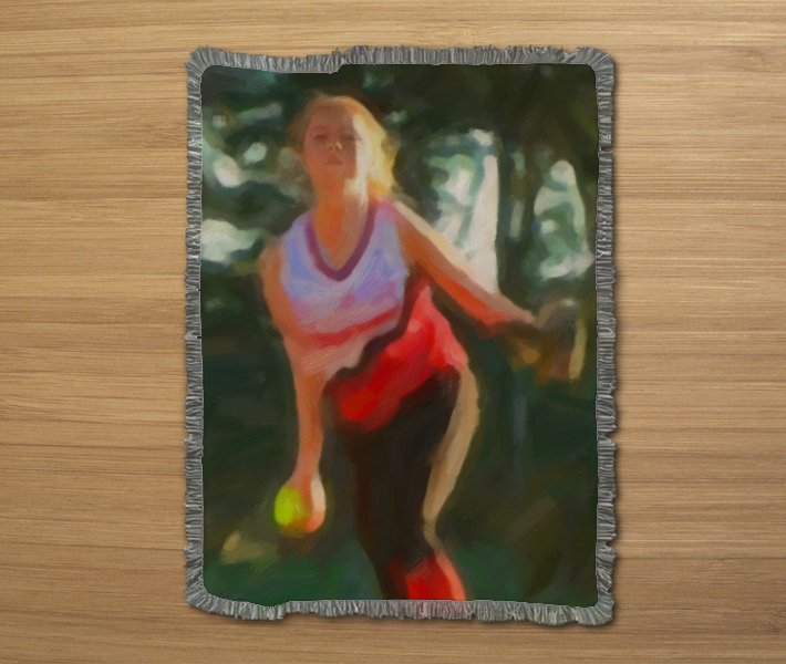 This woven blanket with fringed edges is made of natural fibers that were treated with a polyester surfacing agent to enable the absorption of sublimation dye inks. The printing process provides most durable colors that resist fading over time.