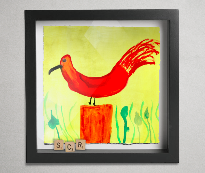 This child’s painting of a red bird comes in a ten-inch square glass shadow box with random wooden letters. The frame thickness measures 1 3/4-inch on the outside and 1 1/2 inch on the inside. Images are printed with archival quality inks that provide a vibrant gamut and accurate color resolution. The acid-free, cold pressed watercolor paper gets torn by hand to yield deckled-edges, for a true fine art appearance. For more information on the individual curio artifact, visit the how-to section.