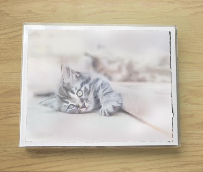 This “Kitten” mixed-media watercolors and pastel painting will contains a combination of pastel and colored pencil painting techniques. The acid-free, cold pressed watercolor paper gets torn by hand to yield deckled-edges, for a true fine art appeal. It will arrive at your door framed in an 11 x 14-inch acrylic box frame and is guaranteed to impress! We innovated frames that ensure the clear acrylic will not touch the actual picture in order to preserve the paint.