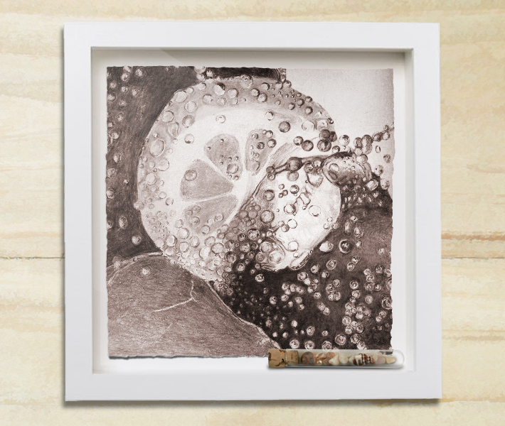 This sepia expression of a lemon slicing its way through water comes in a ten-inch square glass shadow box with customized glass vial with small shells paraphernalia. Images are printed with archival quality inks that provide a vibrant gamut and accurate color resolution. The acid-free, cold pressed watercolor paper gets torn by hand to yield deckled-edges, for a true fine art appearance. To view other available curio box paraphernalia, select the Designs > Shadow Box Elements tab in any blank designer template.