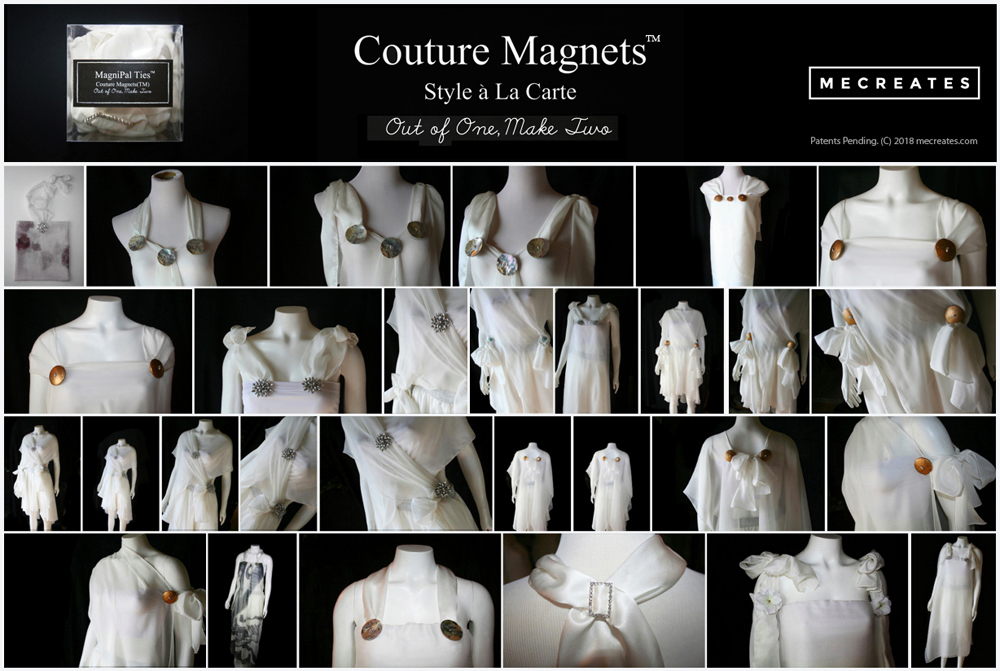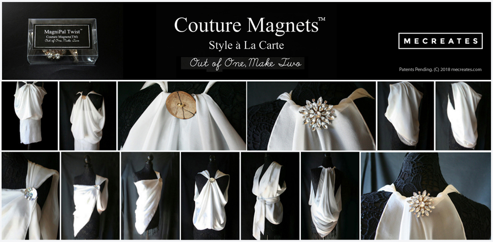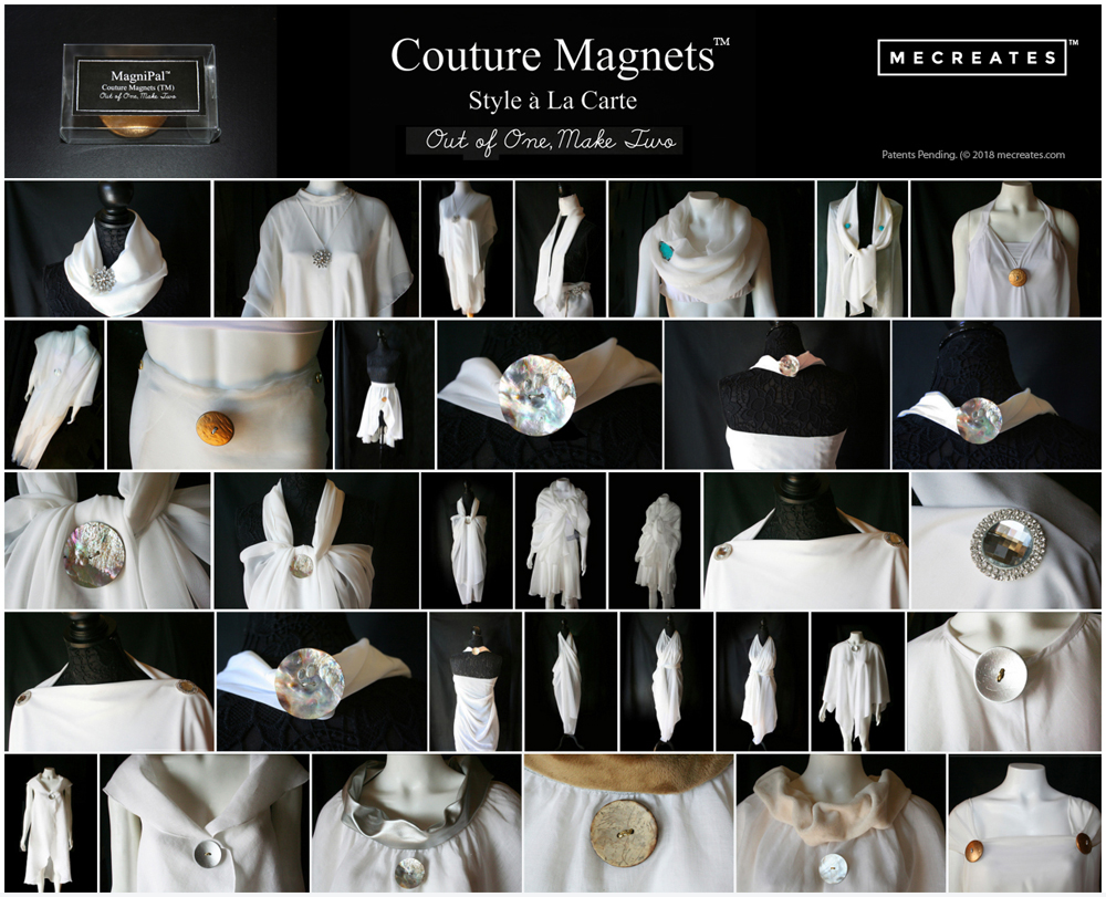 The Couture Magnets™ fashion fastener system turns original fabric or reproduction art into a wide variety of space-saving and versatile fashions that can now be displayed in delightful, new ways. It is like having a brand new wardrobe without all of the clutter.