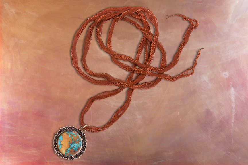 A beautiful copper-finished pendant features an etched back and fairy ribbon that adds a whimsical touch to this necklace. The pendant is handmade on demand and baked in special heaters to provide a smooth, clear appearance and to seal the image.