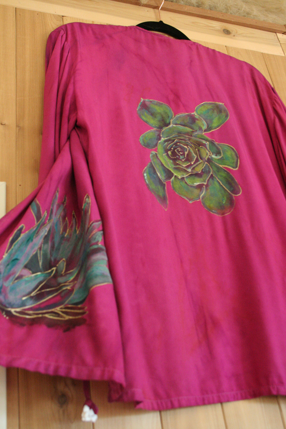 Is this an original, painted showcase garment or a reproduction? We innovated a way of painting directly on the fashions of your choice, then reproduce it to look like original art. Either paint directly on the fabric and then send us pictures in a specified way or send in the painted garment or we will take pictures for you. Then, reproduce the art on a wide variety of fashion products which we will paint-decorate with noticeable brush strokes, each resulting in original art. More Info.