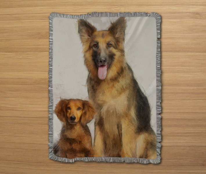 This woven “Shepherd and Friend” blanket with fringed edges is made of natural fibers that were treated with a polyester surfacing agent to enable the absorption of sublimation dye inks. The printing process provides most durable colors that resist fading over time.