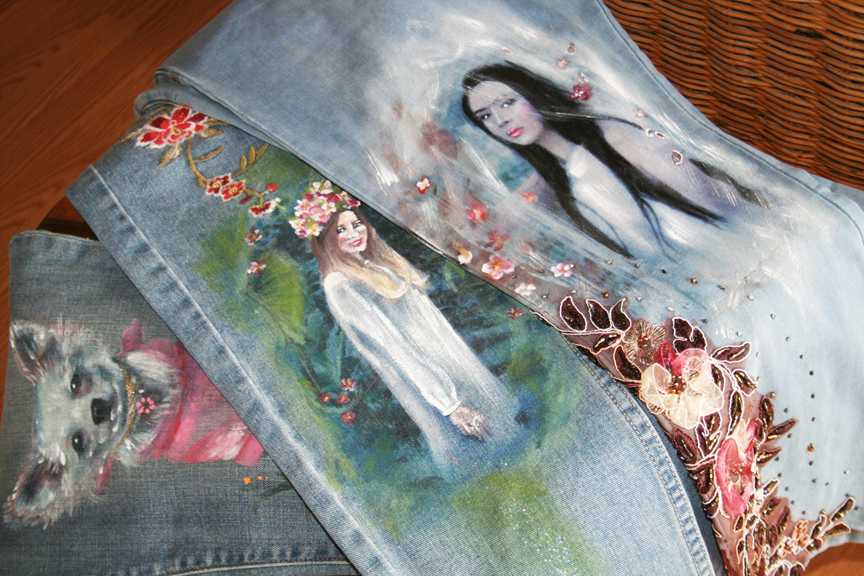 Is this an original, painted showcase garment or a reproduction? We innovated a way of painting directly on the fashions of your choice, then reproduce it to look like original art. Either paint directly on the fabric and then send us pictures in a specified way or send in the painted garment or we will take pictures for you. Then, reproduce the art on a wide variety of fashion products which we will paint-decorate with noticeable brush strokes, each resulting in original art. More Info.