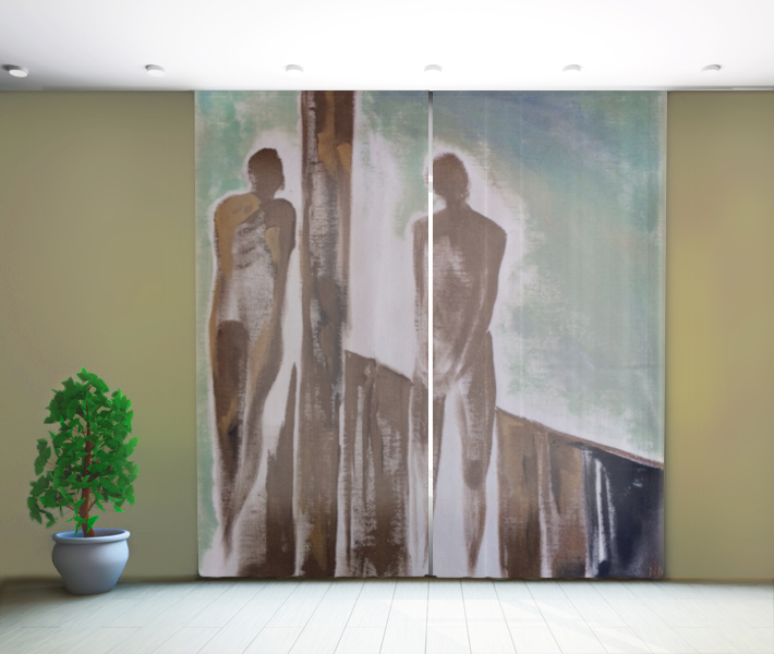 The non-wrinkle polyester material of this set of “Two Men” curtain panels has a natural cascading drape to softly frame any window. Due to the nature of polyester fabric that repels mildew, these panels may be used in outdoor environments, such as in enclosed patio areas and garden casbahs.