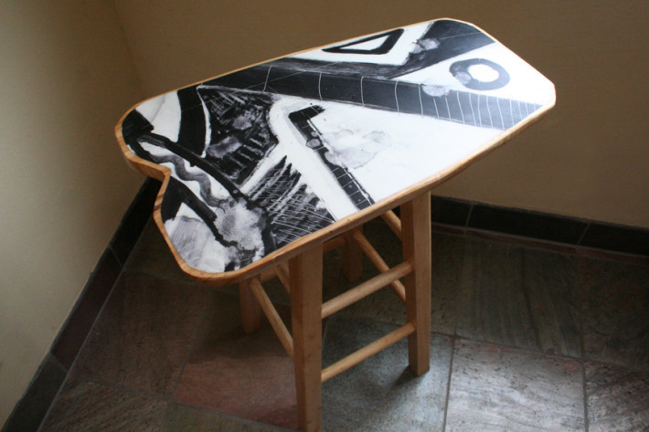 Starting with an irregularly carved cutting board, cut a furniture wrap featuring your own artwork to size and afix to the wooden background. You can also glue a poster to the surface. Apply Easy Cast two-step process epoxy over the entire surface and let dry for a day. If you get out all the bubbles (may require a blow torch), you end up with a high gloss surface. The shown example was sanded down for a smooth satin finish. The example in this image was placed onto a wooden barstool purchased at Target for only fifteen Dollars.