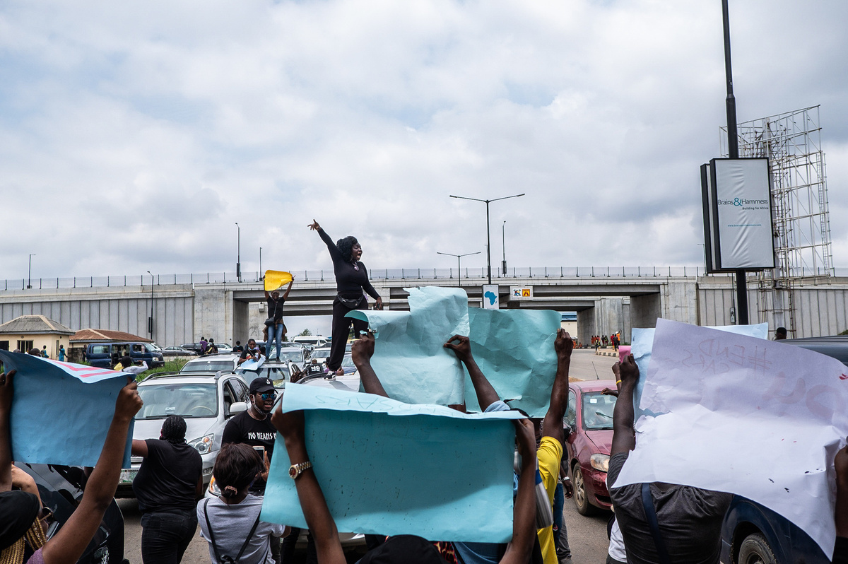 Yagazie Emezi: Untitled, from “#EndSARS Protests.” PHotojournalist Emezi documents Nigeria’s October 2020 protests of the police brutality of the country’s Special Anti-Robbery Squad (SARS).