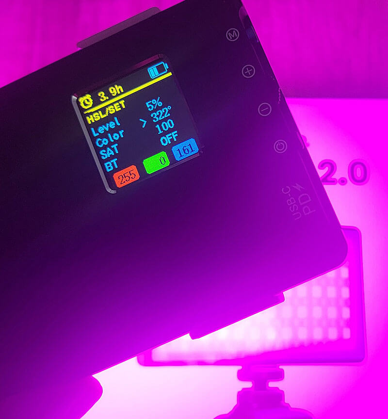 The compact Smart LCD control center is crystal clear to read. In HSL mode, it indicates battery life, brightness, color spectrum options, saturation, Bluetooth connectivity and RGB hue settings. In CCT mode, it indicates brightness, battery, color temperature, green/magenta tint control, selection of the 7 preprogrammed effects, and a frequency setting for the effects (10 stepless speed levels).