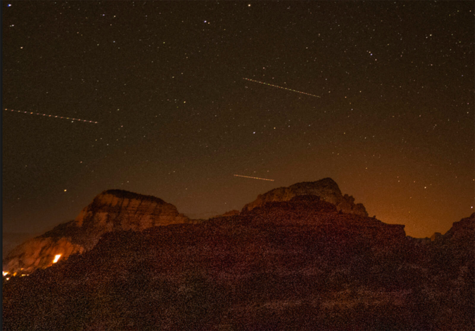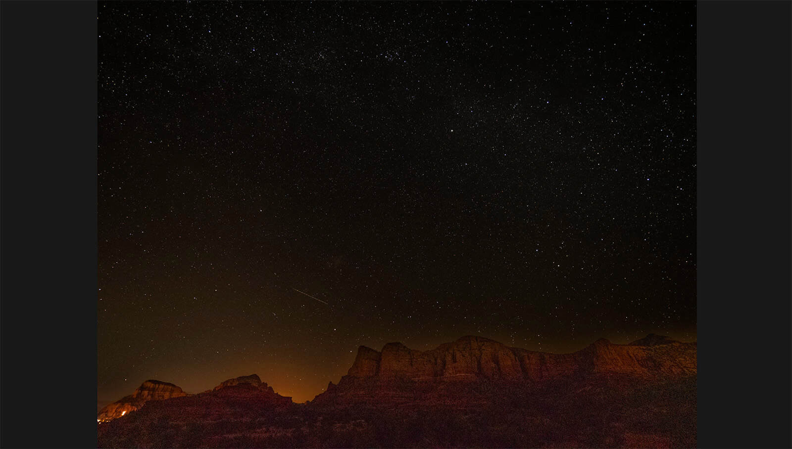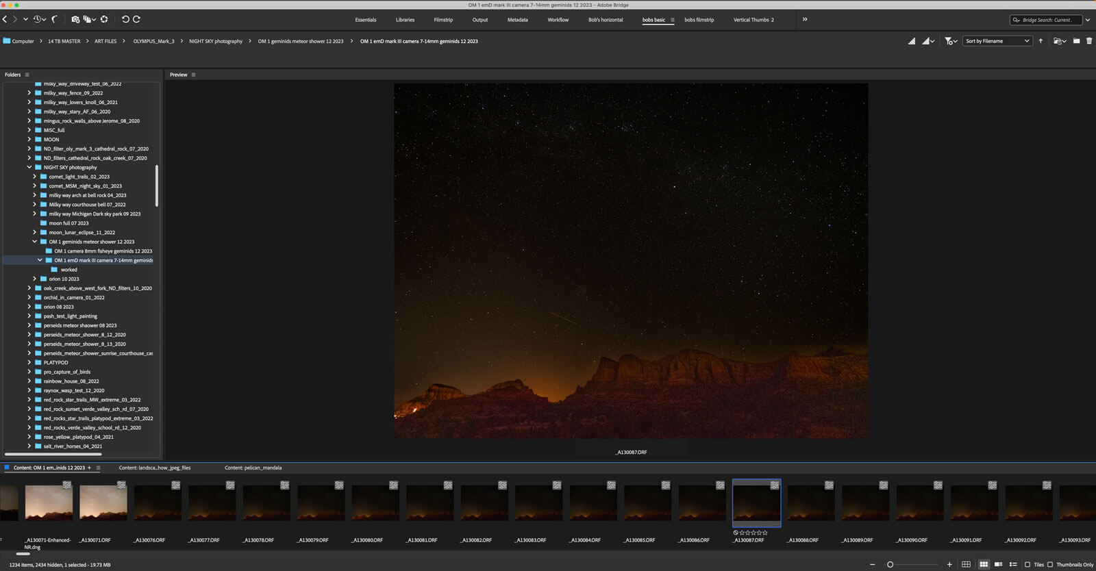 Why do I call it “mining for meteors?” Well, out of 1,230 images captured, there were only around 40 containing visualized meteors. Eventually, only 27 made the final cut. Every photo needed to be examined to determine if it was usable. It’s a long process but worth it. I found that Adobe Bridge was a big help after I figured out a couple of things to make it easier to see the images.